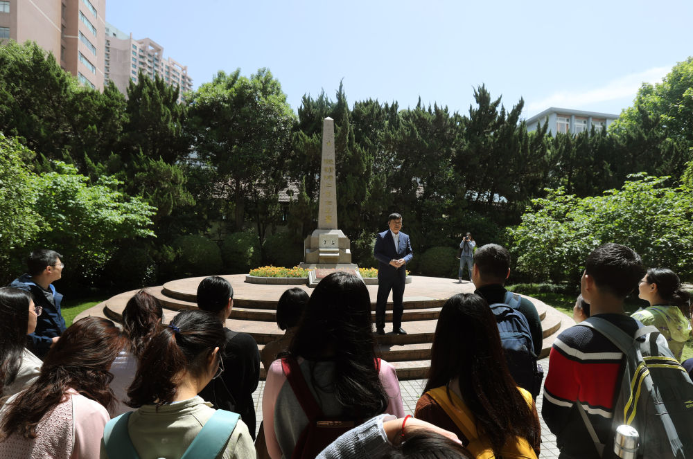在上海交通大学校园里的史霄雯、穆汉祥烈士墓前,刘统教授在讲述两位烈士牺牲的历史经过(2019年5月7日摄)。新华社记者 刘颖 摄