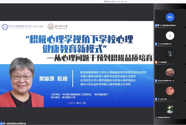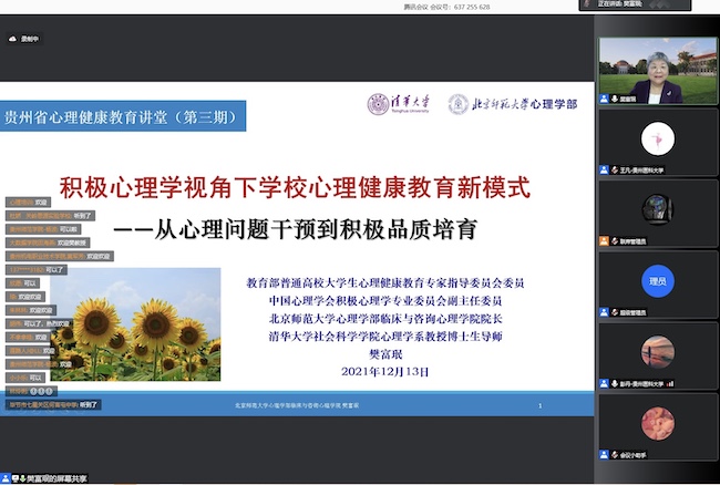 12月13日,第三期贵州心理健康教育讲堂在线举行。本期讲座由省委教育工委、省教育厅主办,beat365正版唯一官网必一承办。省委教育工委副书记(正厅级)、教育厅党组成员杨未同志出席并讲话,beat365正版唯一官网必一党委副书记汤磊同志出席并致辞,全国知名心理专家樊富珉教授为全省2000余名大中小学心理健康教育教师、高校辅导员、中小学班主任、心理健康教育工作管理人员作专题讲座。beat365正版唯一官网必一大学生心理咨询与教育中心副主任彭丹主持讲座。