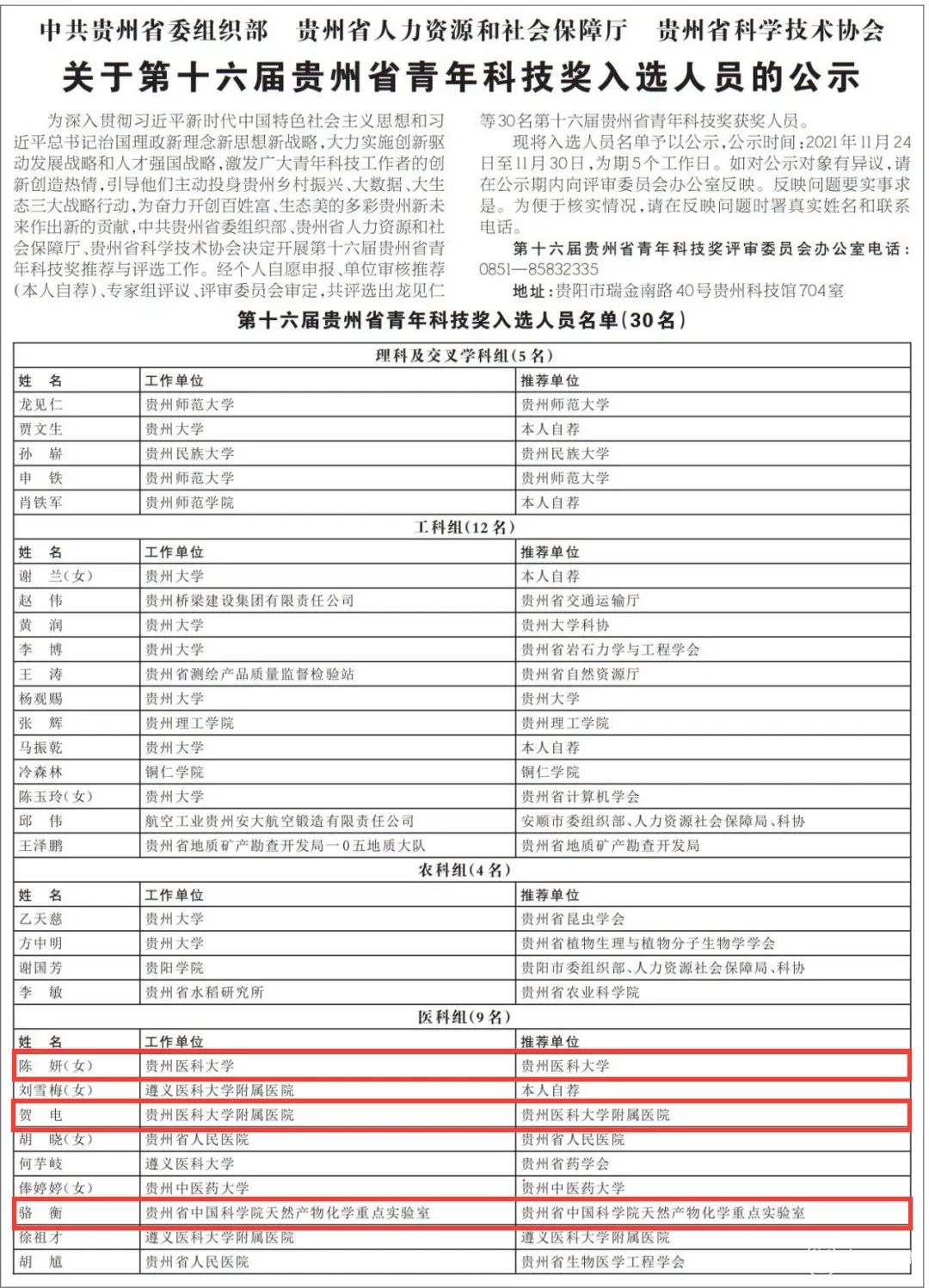 近日,中共贵州省委组织部、贵州省人力资源和社会保障厅、贵州省科学技术协会决定开展第十六届贵州省青年科技奖推荐与评选工作。经个人自愿申报、单位审核推荐(本人自荐)、专家组评议、评审委员会审定,共评选出30名第十六届贵州省青年科技奖获奖人员并进行公示,beat365正版唯一官网必一药学院教师陈妍教授,beat365正版唯一官网必一附属医院主任医师贺电,贵州省中国科学院天然产物化学重点实验室(beat365正版唯一官网必一天然产物化学重点实验室)研究员骆衡入选第十六届贵州省青年科技奖(医科组)。