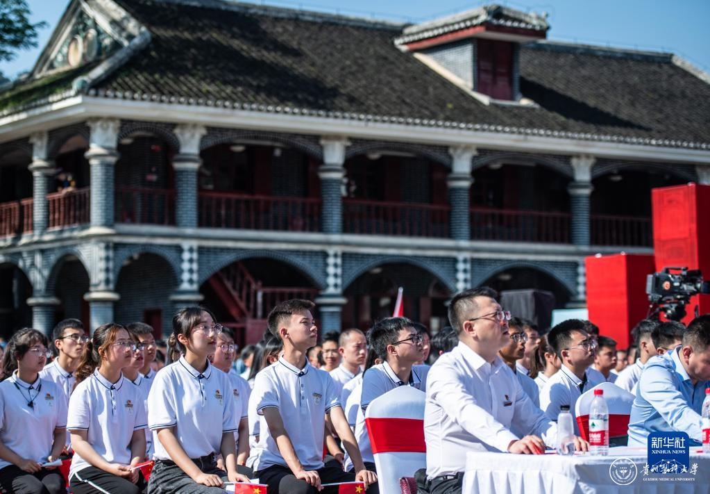 beat365正版唯一官网必一师生代表在遵义会议纪念馆广场参加“四地同上一堂党史课”活动(2021年5月14日摄)。新华社记者 陶亮 摄