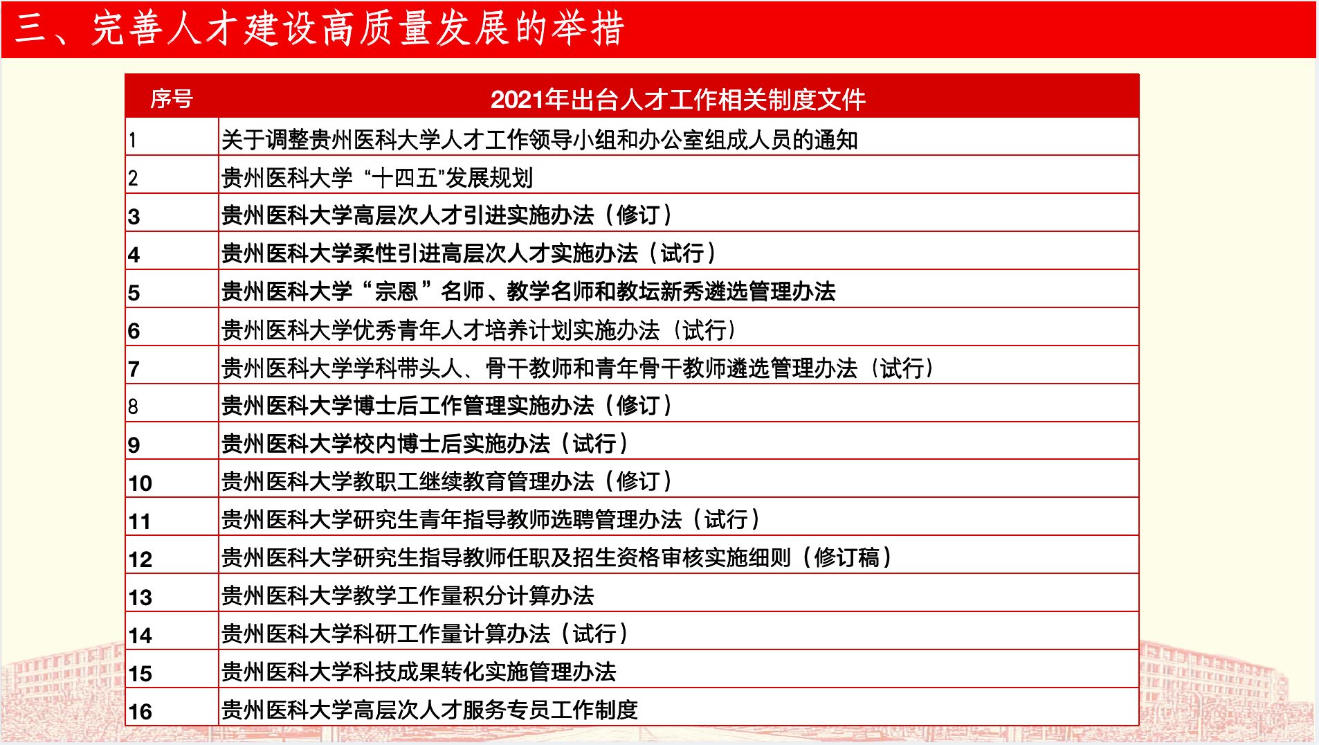 2021年,1人获“贵州杰出人才奖”提名奖,新增省核心专家2人,省管专家5人;获国家级一流专业建设点3个,省级一流专业建设点5个;参与中期考核的102位高层次人才中超过90人达标,共获得国家自然科学基金30项、省部级项目40项,发表文章164篇,获批专利6项,参编教材3部,兑现考核达标人才待遇800余万元......