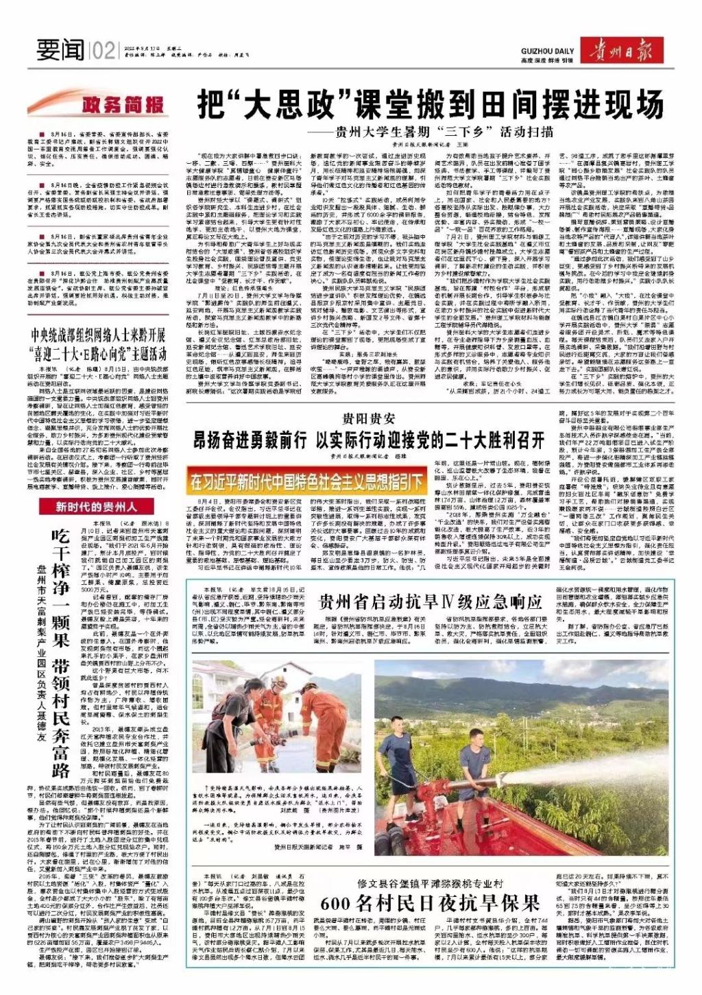 在“三下乡”实践的熔炉中,贵州的大学生们增长见识、砥砺品质、强化本领,正努力成长为可堪大用、能负重任的栋梁之才。