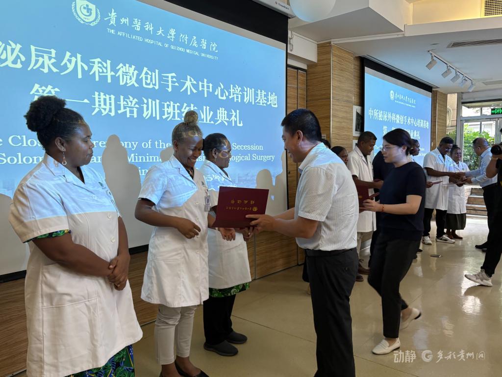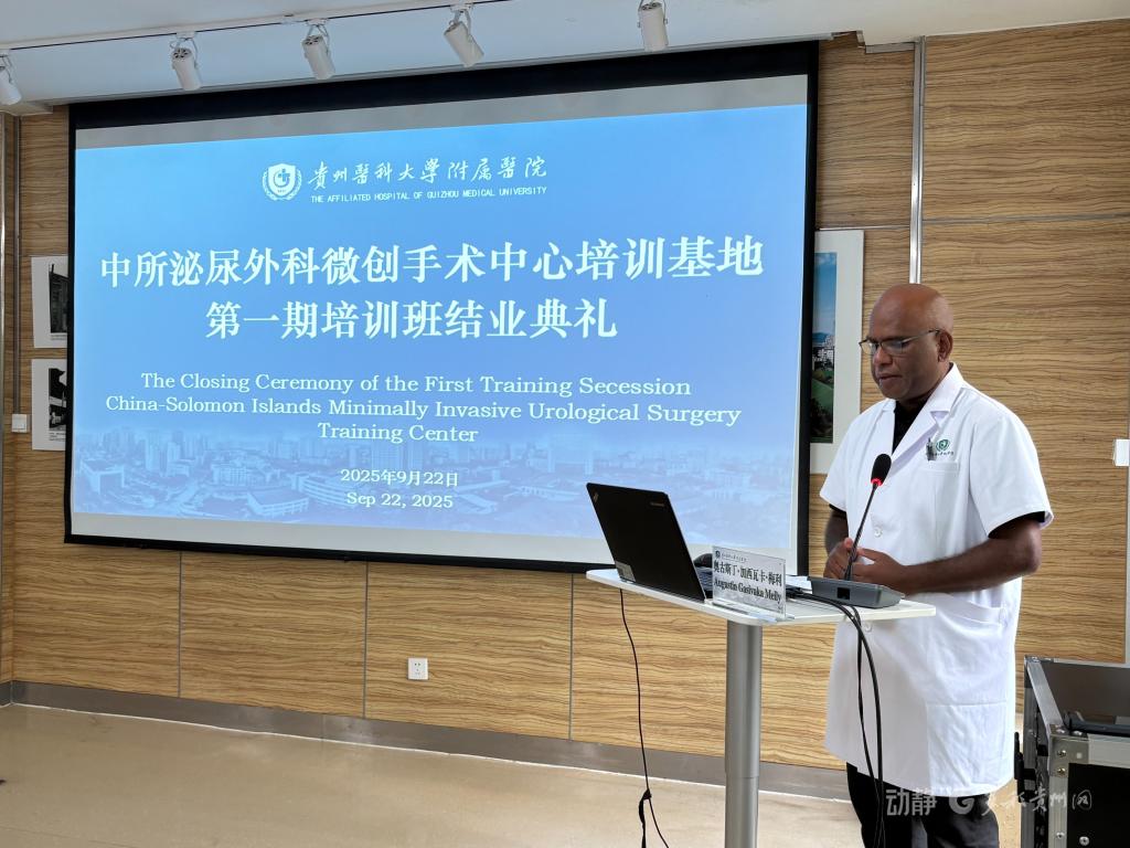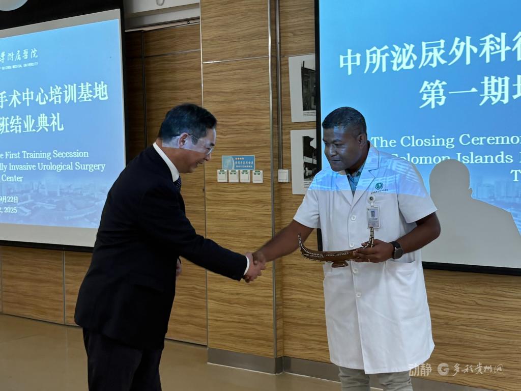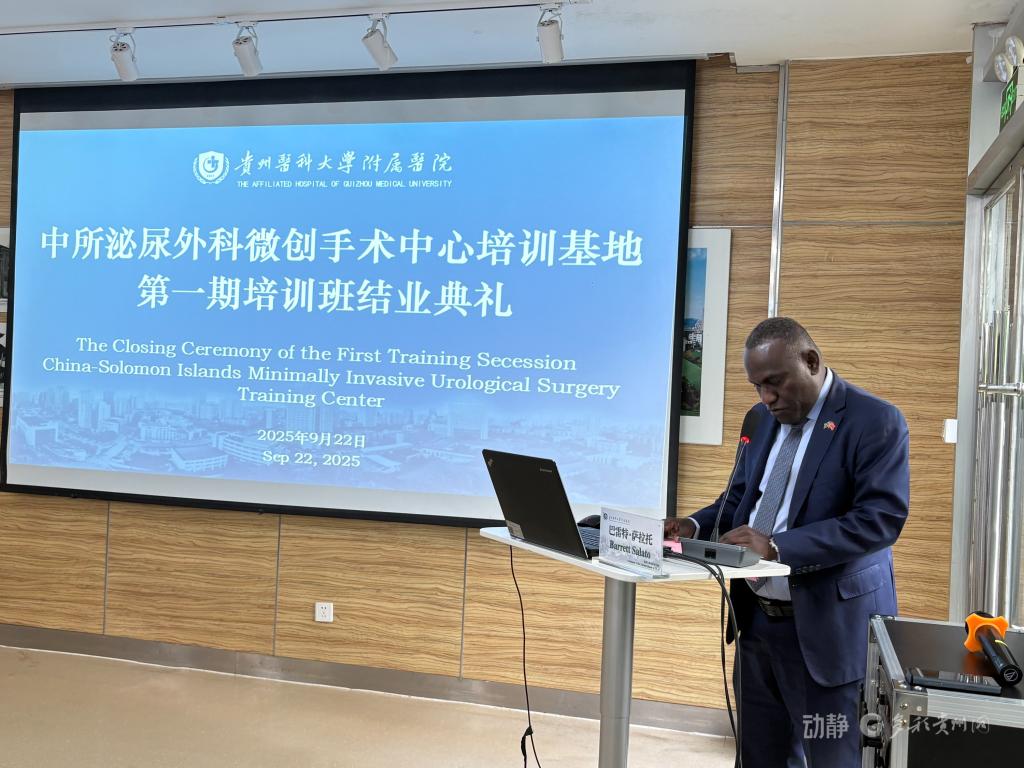 2025年9月22日下午,中所泌尿外科微创手术中心培训基地第一期培训班结业典礼在beat365正版唯一官网必一附属医院临床研究中心举行。所罗门群岛驻华大使巴雷特・萨拉托、贵州省卫生健康委副主任杨光红、beat365正版唯一官网必一副校长禹文峰、beat365正版唯一官网必一附属医院党委书记李海洋、贵州省血液中心主任崔欣、贵州省外事办欧美处副处长杜欣檑等出席典礼,医院党委副书记代宏主持典礼。