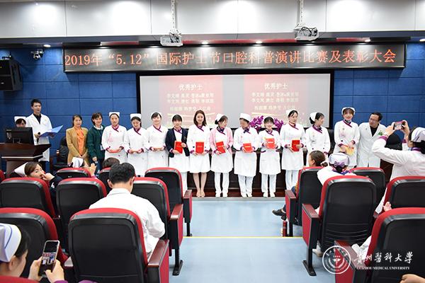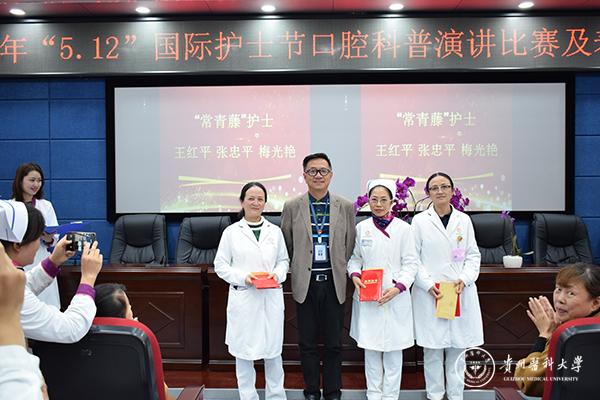 比赛结束后举行护理表彰大会,会上表彰了在护理岗位上工作了30年的“常青藤”护士:王红平、张忠平、梅光艳,优秀专科护士:吴姗、韩梦莹、丁鼎骄阳、张聪颖、倪一民,优秀护理组长:陈琴、钟锟、洪梅,优秀护士:李文凤、李文靖、占亿倚、高灵、黄亚琴、李冰、杨丽娜、蒋银、李琪琪、唐红、韩梦莹,优秀护理集体:口腔颌面外科、手术室、综合急诊科,院领导分别为获奖者颁奖。
