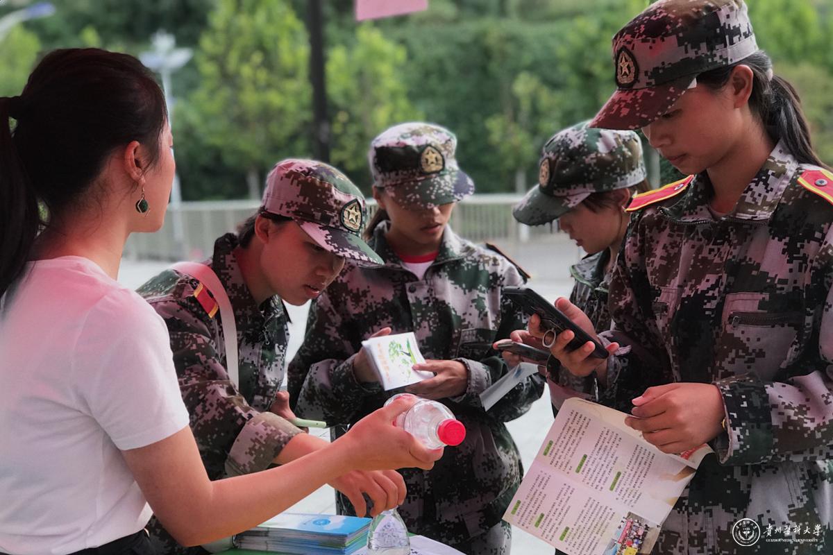 活动现场,温心之声和心协成员为2019级新生准备了水、西瓜、扇子和心理健康知识宣传手册。新生结束了高强度的训练后,路过现场可以免费领取水和西瓜,工作人员耐心地为他们发放心理健康知识手册,给他们介绍大学生心理健康教育与咨询中心,告诉新生在出现心理困扰时可以向中心的老师寻求帮助,并告知寻求心理帮助的途径。
