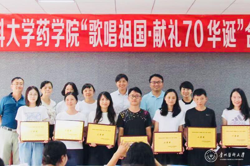 全体教职工按学科分为7组队参加比赛,演唱曲目为《我和我的祖国》《年轻的朋友来相会》,比赛中,大家热情高涨。经过激烈角逐,药物分析学科组获得歌唱比赛一等奖,行政组、实验中心组获得二等奖,临床药学学科组、生药中药学学科组、药剂学学科组、药物化学学科组获得三等奖。学院领导为获奖组一一颁发奖牌。