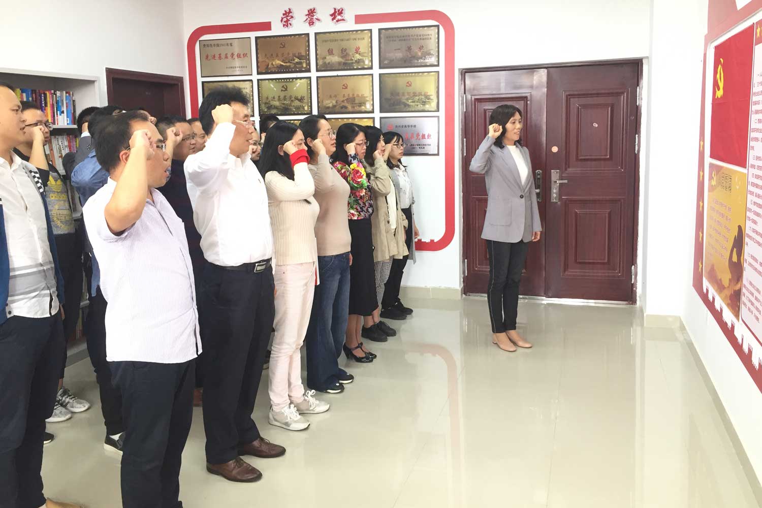 韩贞习从中国共产党成立后到土地革命、抗日战争和解放战争时期、新中国成立以来的三个历史时期,向全体教师党员介绍中国共产党入党誓词的由来。院长杨成兰带领全体党员重温入党誓词。最后,全体党员满含深情地集体合唱爱国主义歌曲《我和我的祖国》。