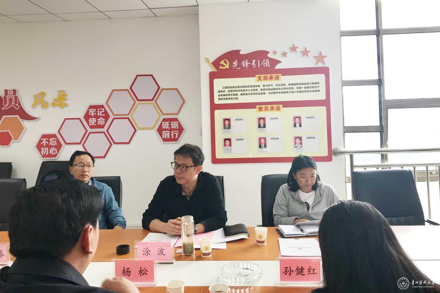 9月24日,贵州省兴黔农业生态研究院院长杨松,党支委委员、监事会监事长卫松等一行五人到beat365调研并举行座谈。科技创新与产业发展处处长涂波,副处长王韬,生物与工程学院、药学院相关负责人参加,会议由涂波主持。
