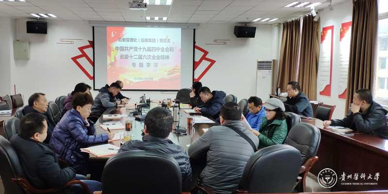 11月29日,后勤管理处(后勤集团)党总支在南校区颂雅楼五楼会议室召开专题会议,学习党的十九届四中全会和省委十二届六次全会精神。党总支副书记周云蓉主持会议并领学《中共中央关于坚持和完善中国特色社会主义制度推进国家治理体系和治理能力现代化若干重大问题的决定》,处长孙西凌领学中国共产党第十九届中央委员会第四次全体会议精神,副处长吴陵江领学中国共产党贵州省第十二届委员会第六次全体会议精神。后勤党总支委员、副科级以上干部、各党支部书记参加学习。