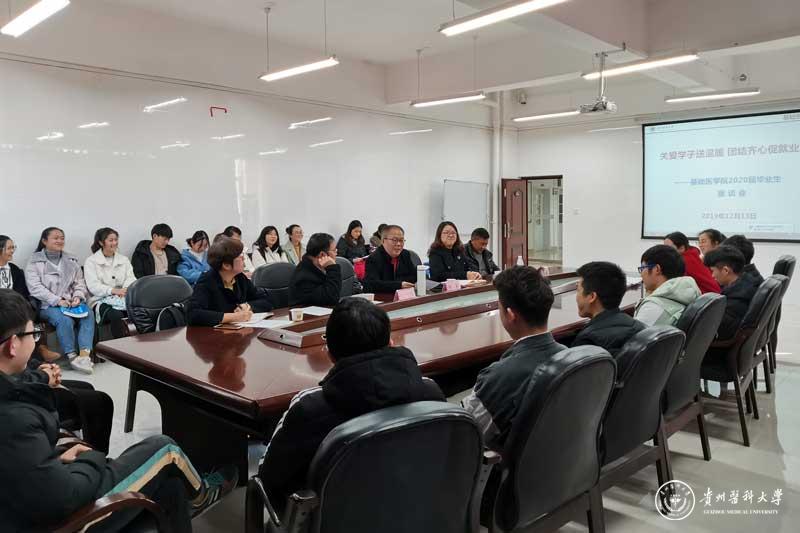 12月13日,基础医学院在南校区务本楼201会议室召开“关爱学子送温暖 团结齐心促就业”2020届毕业生座谈会。基础医学院院长曾柱、党委副书记王妤煜、副院长刘杰麟、副院长张春林、教学管理科和学生科相关老师、辅导员及2020届毕业班学生参加座谈会。会议由学生科负责人陈培各主持。
