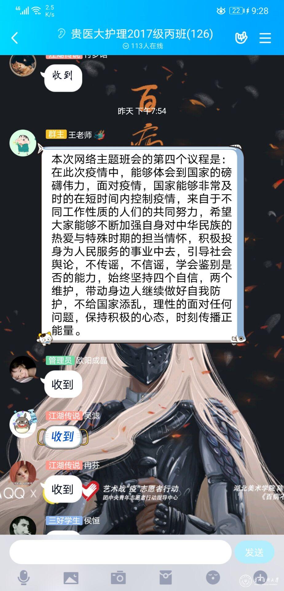 为了贯彻落实《beat365正版唯一官网必一在新冠肺炎疫情防控期间加强思想政治教育的工作方案》通知的要求,做好假期的学生思想政治教育工作,2月25至3月1日,护理学院全体辅导员通过QQ群、微信群、视频会议、召开主题班会等形式为全院本科生、研究生开展“抗疫”主题网络思想政治教育。