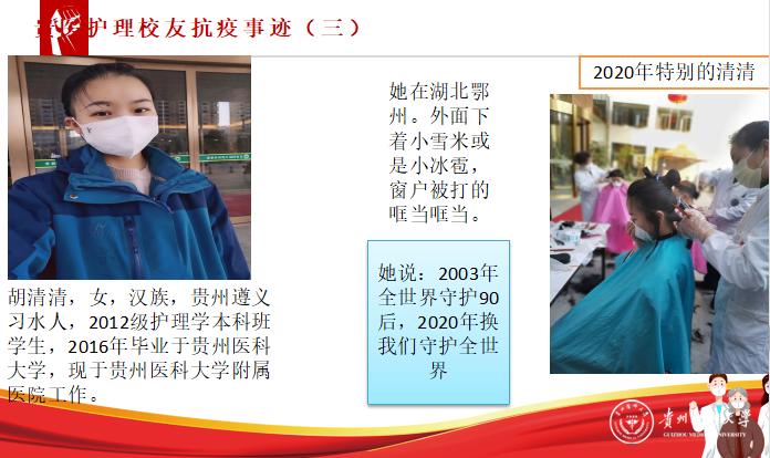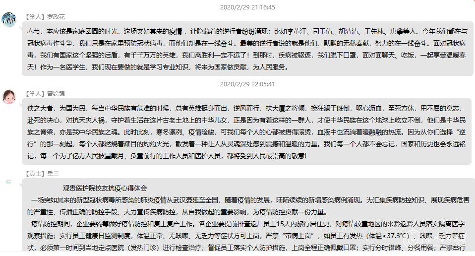 各班辅导员老师结合当前新冠肺炎疫情防控工作和学生们面临的主要问题,有针对性地开展网络思想政治教育。例如,17级、18级辅导员通过宣讲贵医护理校友的抗疫事迹和贵医护理学子做疫情防控志愿者的事迹来开展思想政治教育和专业教育,引导学生结合自身实际开展讨论,分享感悟,增强学生们对护理专业的认同感,对生命健康与志愿服务的认识。