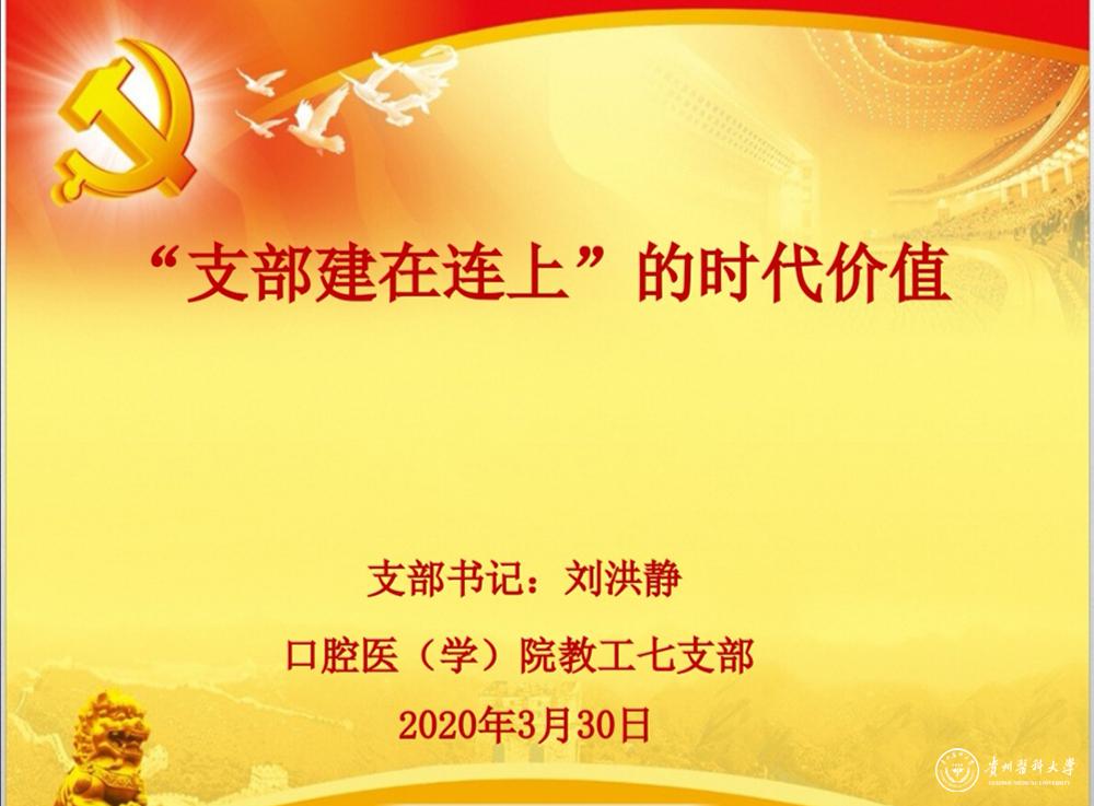 由于新型冠状病毒的侵袭,抗疫期间,口腔医院教工七支部坚决执行院党委的指示,将疫情防控作为第一要务。为使各项工作顺利开展,特殊时期,支部书记刘洪静提出了“党建+互联网,党组织生活不松懈”的党建工作模式,七支部全体党员积极响应。