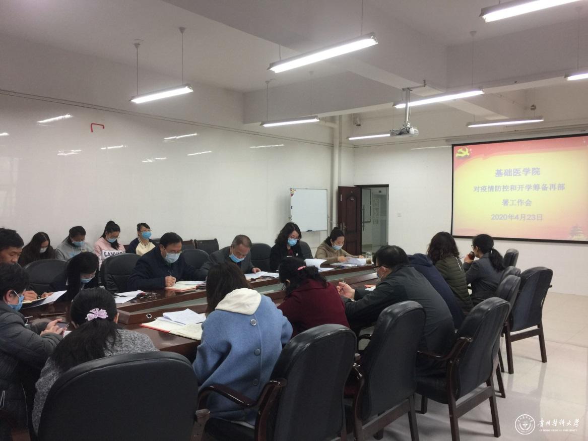 4月23日,基础医学院在务本楼会议室针对疫情防控和开学筹备工作进行再部署。学院领导班子、各职能科室成员、各年级辅导员、各教研室、实验中心负责人参加会议,会议由院长曾柱主持。