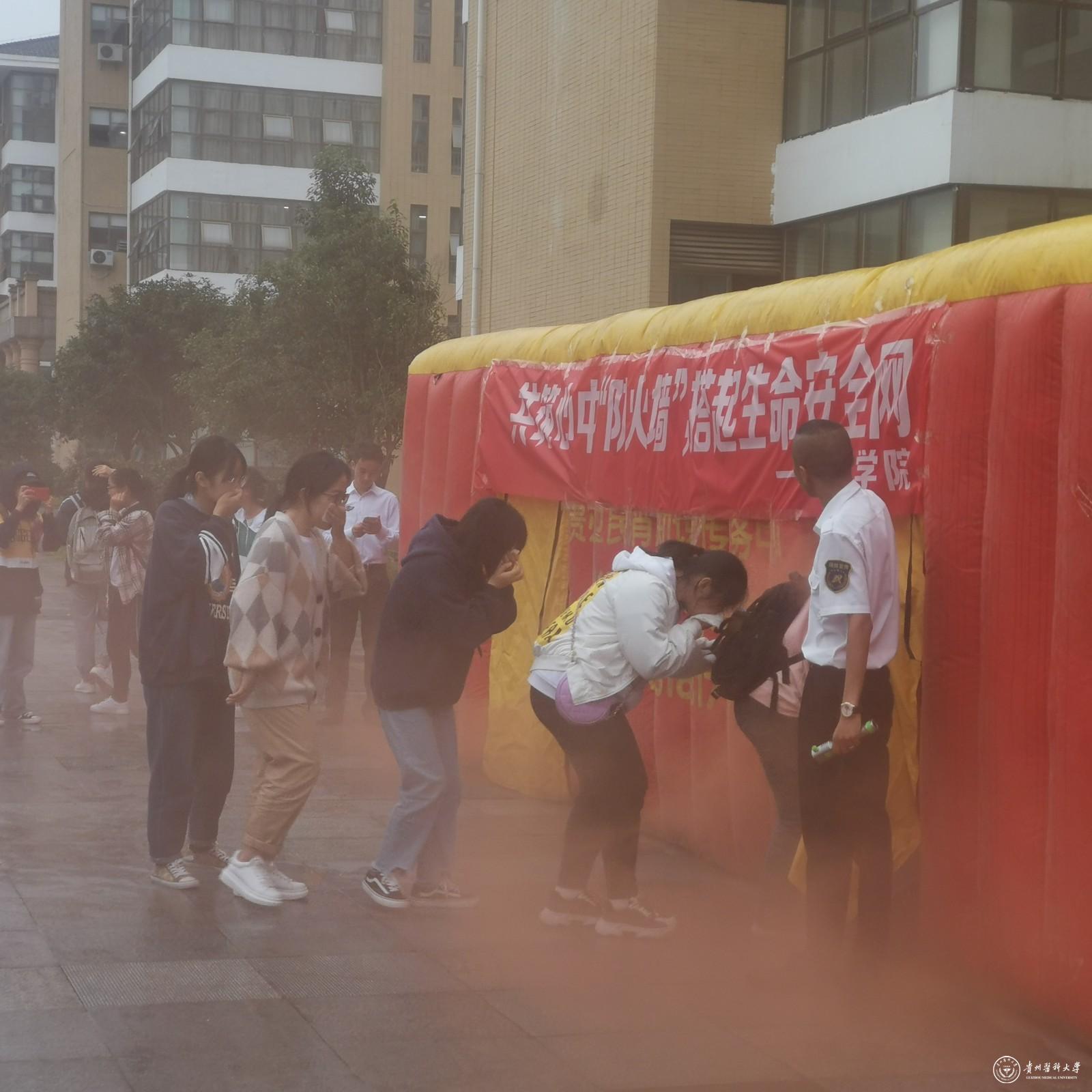 讲座结束后,全体师生有序来到预先布置的火灾模拟现场体验火场情况,感受火场呛辣的浓烟和伸手不见五指的暗黑现场,并按照教官讲解的自救方法进行紧急疏散演练。