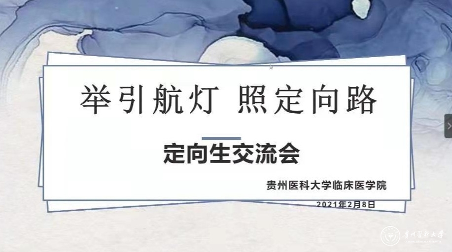 2月8日,临床医学院在腾讯会议开展“举引航灯 照定向路”定向生线上交流会议,帮助临床医学定向学生利用在校时间,合理规划大学学习生活,提高在基层卫生医疗一线服务的意识,激发学习动力。临床医学院党委副书记王筑山,2017级、2018级全体定向班学生、往届临床医学定向班毕业生代表参加会议。会议由临床医学院团委书记、2017级定向班辅导员黎冉主持。