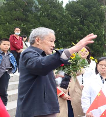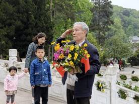 刘爷爷虽年近耄耋,却依然健谈,在同学们满怀崇敬的注目下,主动先和大家讲述红军解放贵州的故事、抗美援朝的故事、中国制造原子弹的故事到祖国今天的伟大成就,现场给同学们上了一堂生动的党史学习教育课。一番讲解后,刘爷爷一步一步走上了纪念碑,对着革命烈士们庄严敬礼并献上鲜花!