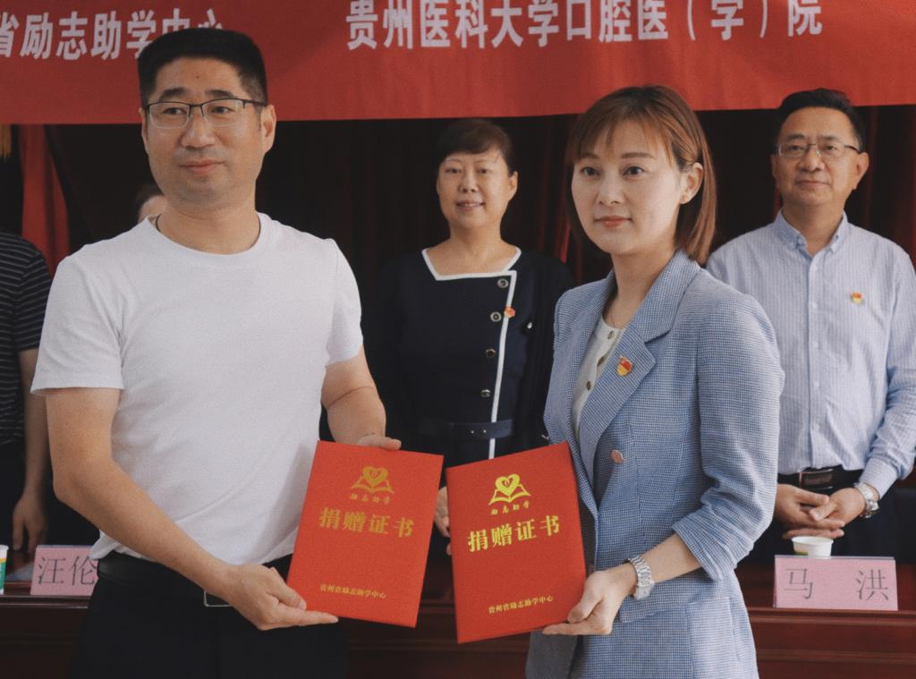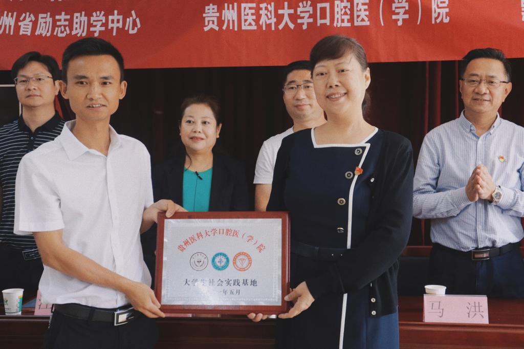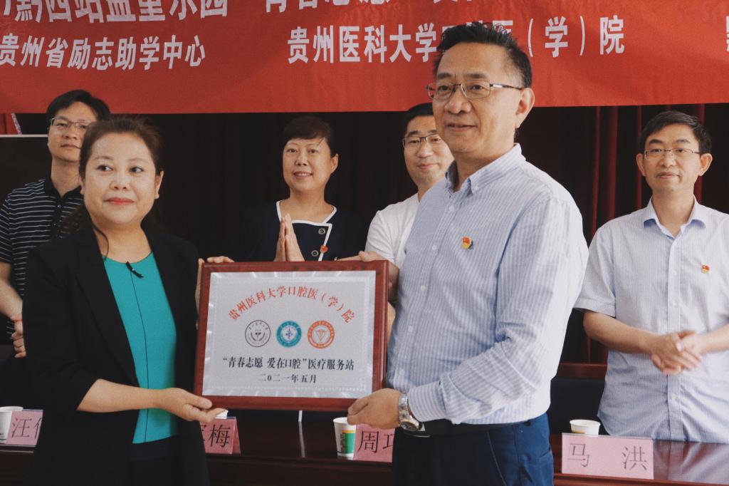 马洪为黔西站益童乐园授“beat365正版唯一官网必一口腔医(学)院‘青春志愿 爱在口腔’医疗服务站”牌,张军梅为黔西站益童乐园授“beat365正版唯一官网必一口腔医(学)院大学生社会实践基地”牌,周巧明为口腔医(学)院颁发爱心共建单位证书。