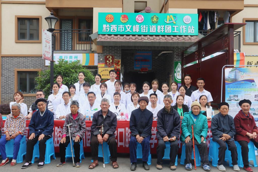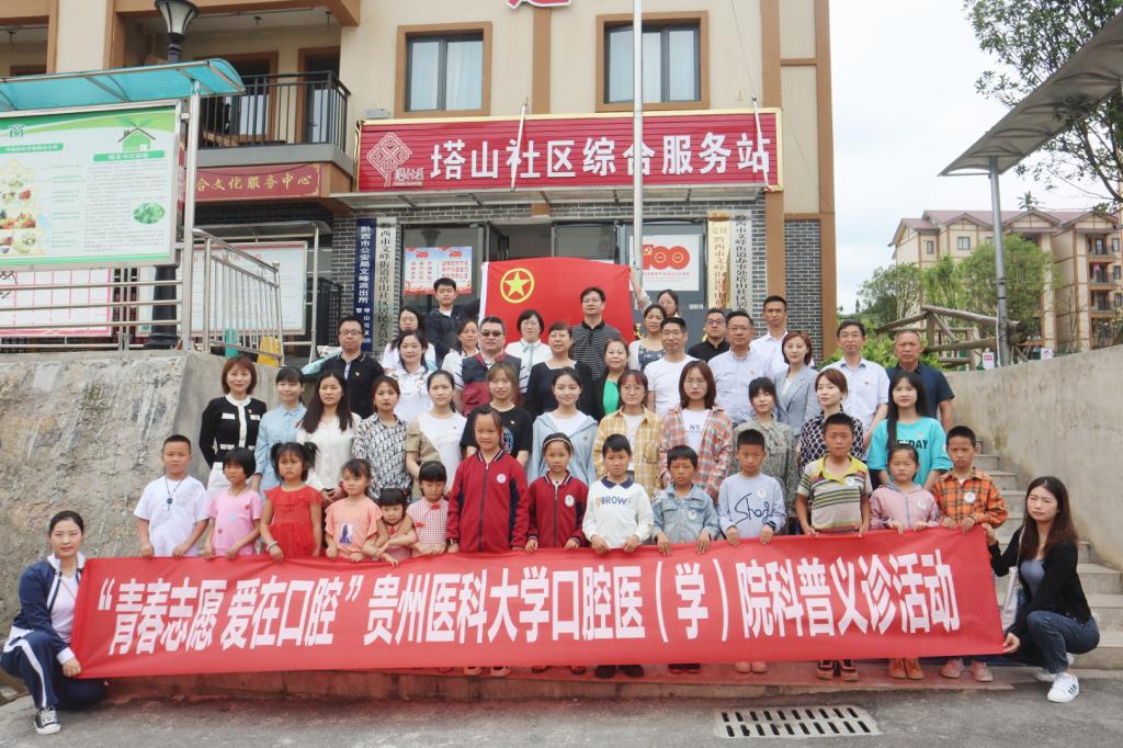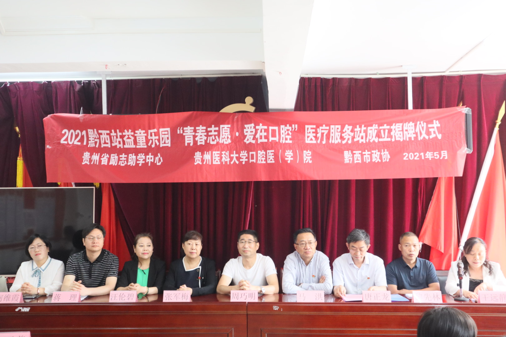 5月16日,由beat365正版唯一官网必一口腔医学院、附属口腔医院(后文简称口腔医(学)院)与贵州省励志助学中心共建的首个【青春志愿·爱在口腔医疗服务站】落地毕节市黔西站益童乐园并举行揭牌仪式。口腔医(学)院党委书记张军梅、院长马洪、副院长唐正龙、党委副书记何雨羲;贵州省励志助学中心秘书长、民盟省直关爱教育支部主委周巧明、秘书长助理、团委书记杨治毅;黔西市政协副主席汪伦碧、黔西市智力支边办主任王远静、黔西市文峰街道党工委书记蒋理、黔西市卫健局副局长何维霞、黔西市民政局副局长黎先林、黔西市文峰街道办事处人大工委主任卢春;上海交通大学医学院附属第九人民医院口腔颅颌面科副主任医师乌丹旦出席揭牌仪式。口腔医(学)院口腔颌面外科医生吴睿、预防及儿童口腔科医生魏宏琳、口腔修复种植科医生刘春影、团委工作人员及塔山社区部分老人和儿童代表60余人参加。