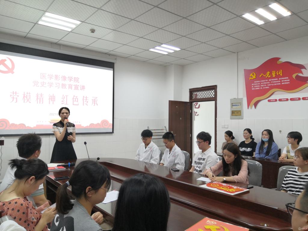为庆祝中国共产党成立100周年,推动党史学习教育扎实开展,6月22日,贵州省2020年劳动模范、贵州省肿瘤医院介入科医师张帅同志走进医学影像学院,开展“劳模精神 红色传承”宣讲活动。学院党委副书记姚琨主持,全体师生党员参加。