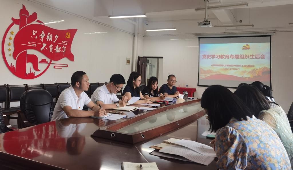 7月20日,基础医学院开展党史学习教育专题组织生活会。校党史学习教育第一督导组成员、党委组织部副部长蔡炼到会指导,会议由支部书记舒莲主持。