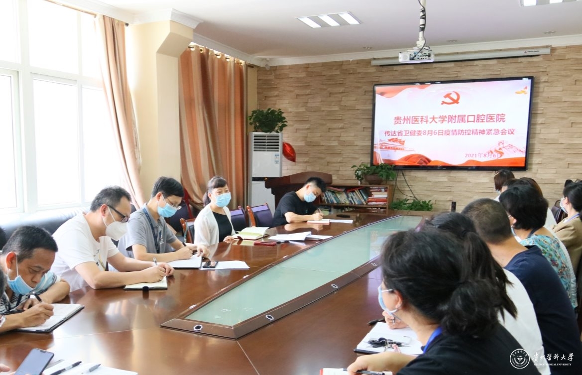 8月6日,口腔医(学)院在行政楼五楼会议室传达省卫健委疫情防控紧急会议精神,院党委书记张军梅主持,各行政职能部门负责人参加。