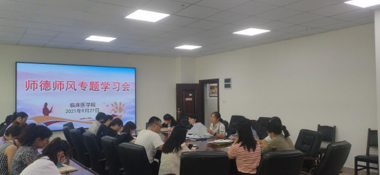 9月27日,临床医学院在科技楼七楼会议室召开师德师风专题学习会,临床医学院全体工作人员、各教研室秘书参加,会议由院党委书记周红主持。
