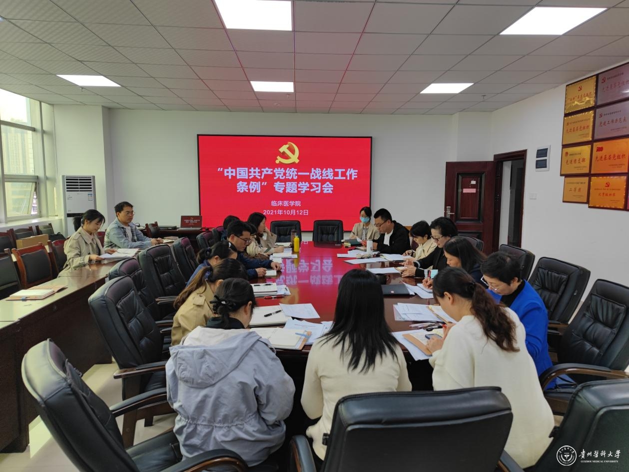 10月12日,临床医学院召开《中国共产党统一战线工作条例》专题学习会。会议由党委书记周红主持,全体教师参加。