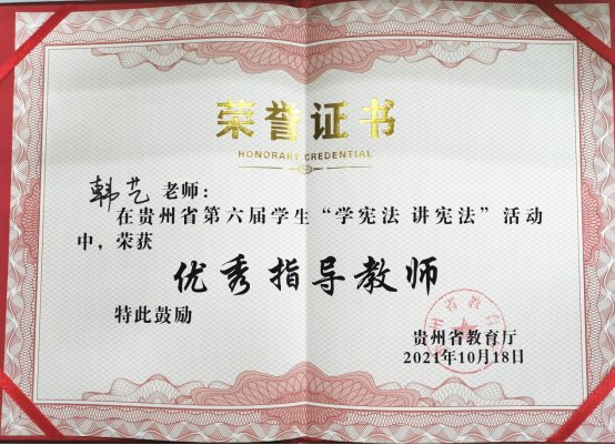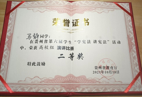 10月18日,在贵州省第六届学生“学宪法,讲宪法”演讲比赛中,公共卫生学院2021级预防医学马静同学演讲的《青年学宪法,星火点灯明》,凭借着充分的赛前准备和优秀的现场表现,荣获“高校组”二等奖。指导老师韩艺荣获“优秀指导教师”称号。
