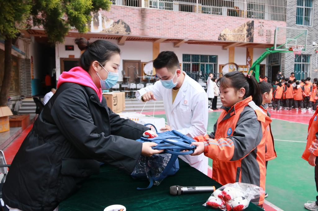 开幕仪式后,与会领导亲切地为孩子们赠送了书包、文具、绘本、牙具等爱心学习和生活用品。