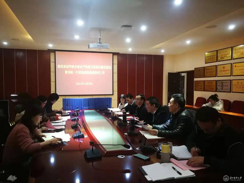 12月28日,学校党委全面从严治党主体责任落实情况第十督查组到医学人文学院开展2021年度全面从严治党主体责任落实情况督导检查。校党委委员、党委宣传部(精神文明办)部长(主任)、党委统战部部长陈颖,校党委统战部副部长任婷,生物与工程学院党委副书记李宗梅,省纪委、省监委派驻学校纪检监察组综合室综合科科长雷豪到医学人文学院党委实地督导检查。医学人文学院党委班子成员,学院各支部书记参加。医学人文学院党委副书记张健主持。
