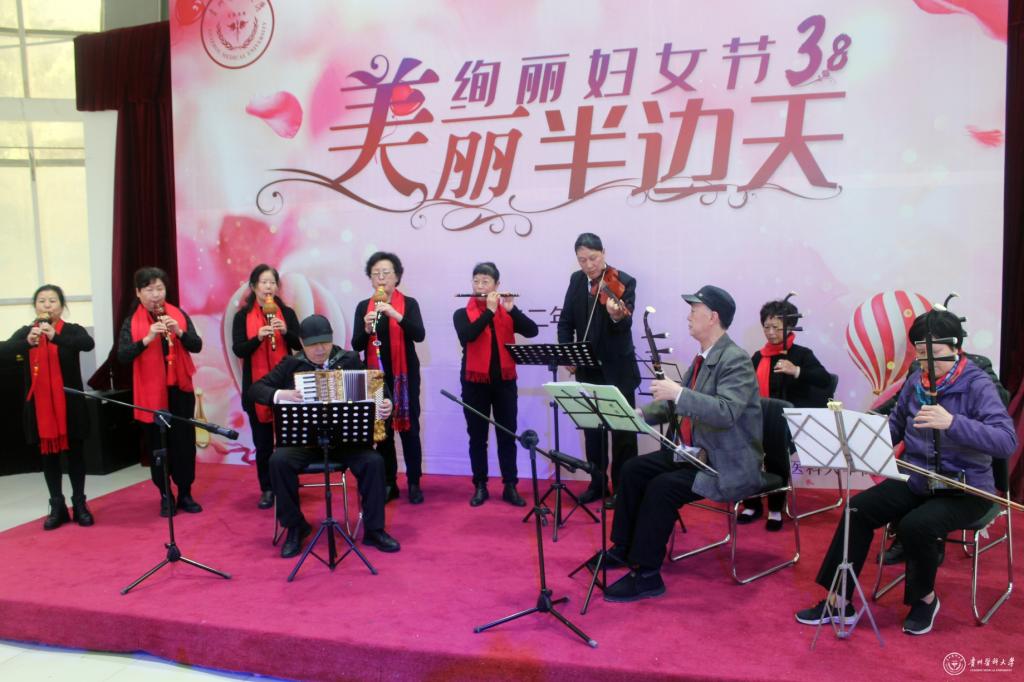活动中,老年器乐兴趣爱好班老同志为女同胞们激情展演歌曲《军中绿花》、《映山红》。