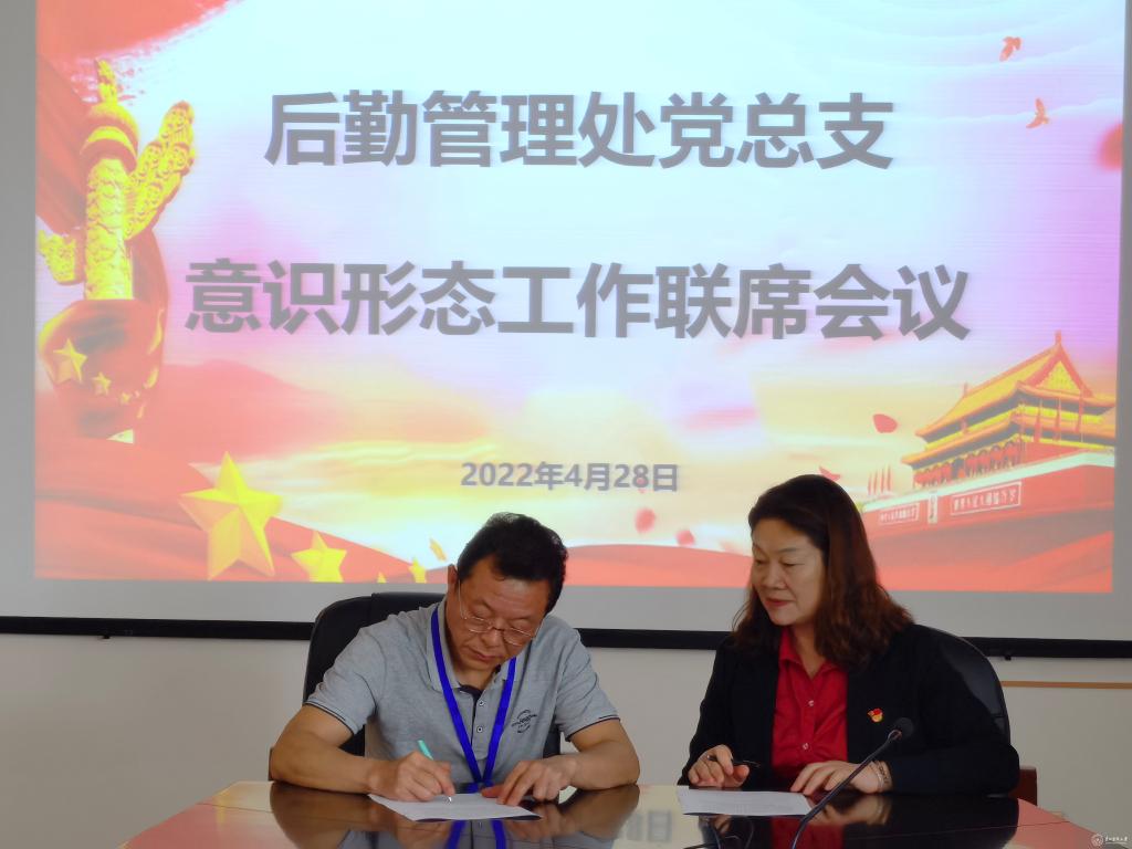 4月28日,后勤管理处党总支在南校区颂雅楼五楼后勤会议室召开2022年上半年意识形态工作联席会议。会议由党总支书记张玲玲主持,党总支全体党员及副科级以上干部参加。