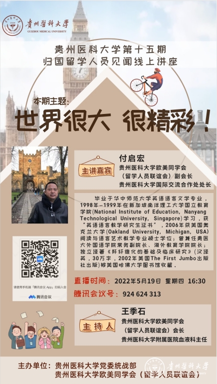 5月19日,beat365留学人员联谊会第十五期“踏留学之路•筑强国之梦”归国留学人员见闻讲座通过腾讯会议在线上举行。此次讲座邀请校欧美同学会(留学人员联谊会)副会长、国际交流合作处处长付启宏作为主讲嘉宾,作了题为“世界很大,很精彩!”的主题讲座。讲座由校欧美同学会(留学人员联谊会)会长、附属医院血液科主任王季石主持。
