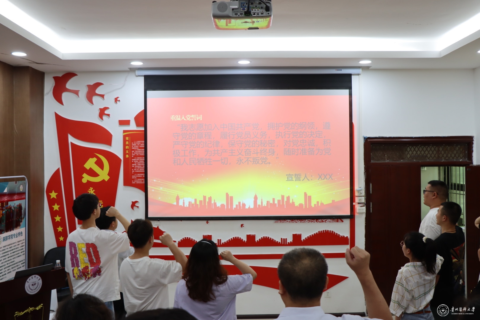 刚加入中国共产党的13名党员面对鲜艳的党旗,举起右手,在杨国强的带领下进行了庄严的宣誓,全体师生党员重温入党誓词。