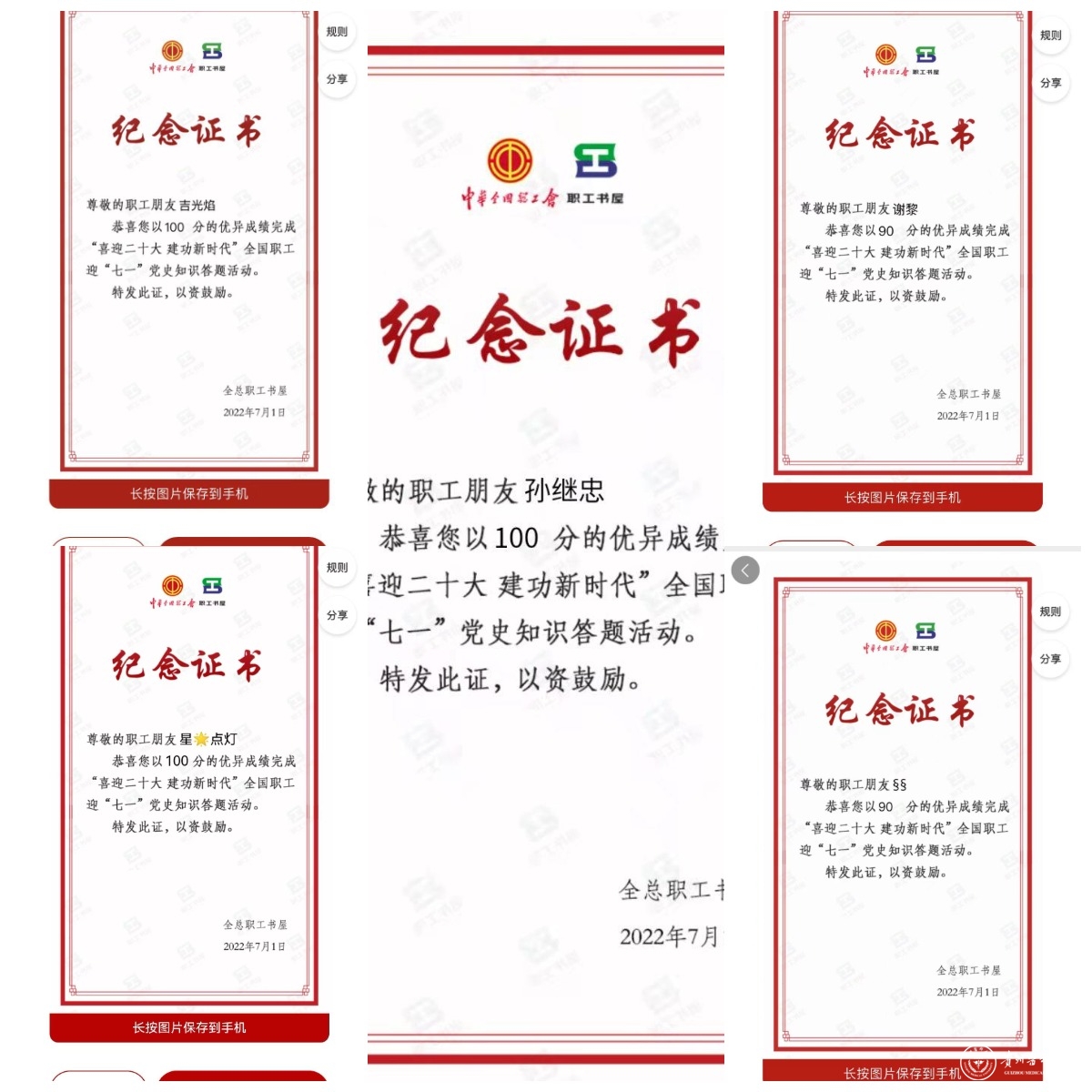 本次竞答活动面向全国广大职工开展,题目内容涉及党史知识、党内法规、工运历史等相关知识。校工会6名党员以平均分96.7获得知识竞答活动证书。
