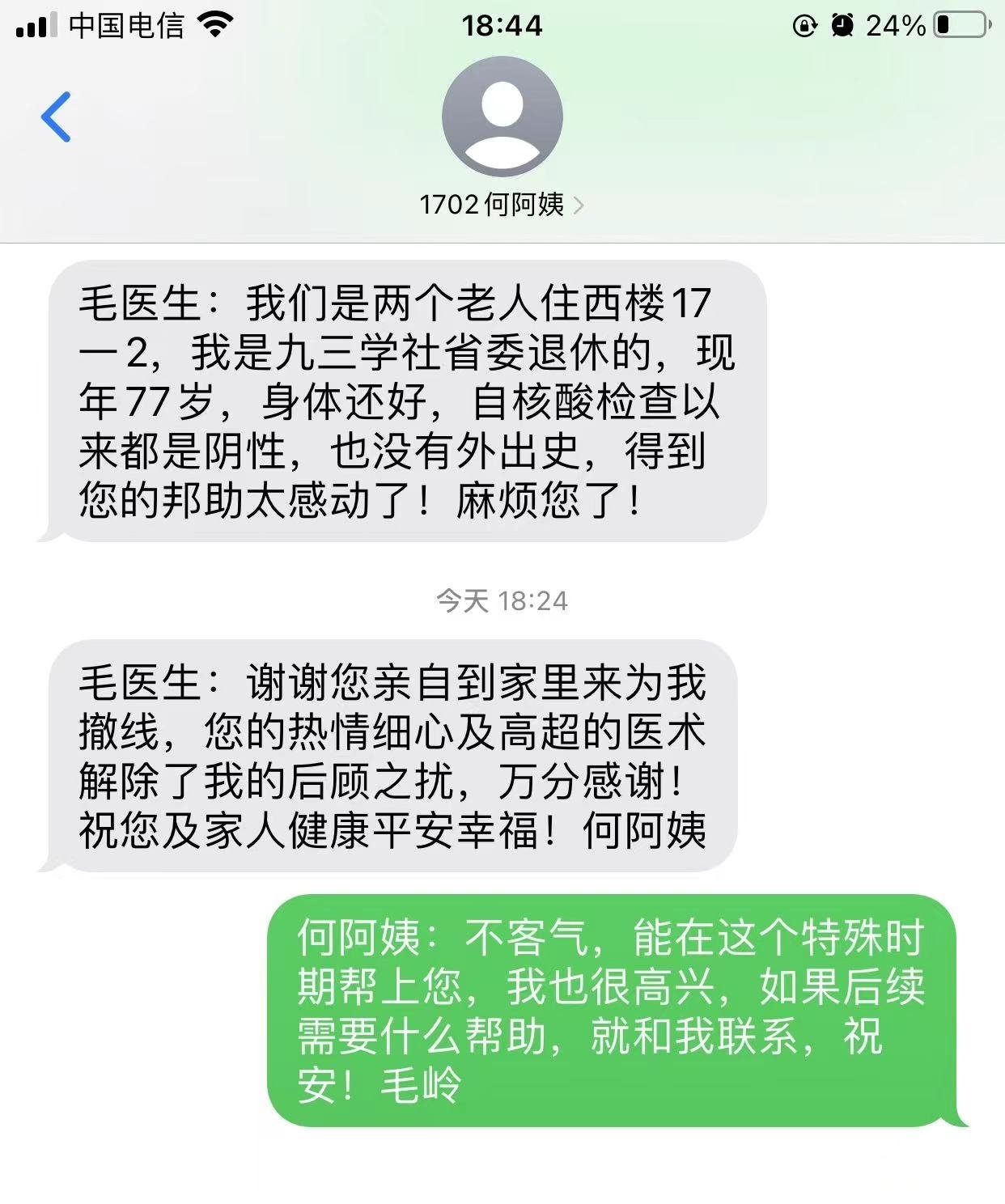 毛岭博士所在小区一位77岁的老人在业主群内求助口腔不适,毛岭博士了解情况后主动联系老人,在符合疫情防控要求的前提下上门为老人解决口腔问题,获得老人称赞。