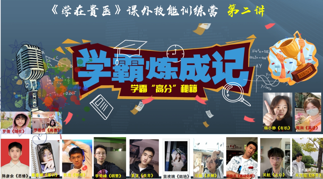 本讲主题是《学霸养成记》,邀请戴蕾郦、罗易佳、田俊员、夏龙、陈彦余、吴茂锟、司颖、罗倩、杨小静、郭茂、周润、李奇峰、苗凌瑞、吴航14位2021级“协和班”学长学姐分享他们在各科学习过程中的高分秘籍,他们结合自身学习经历,围绕如何高效学习、备考英语四六级考试、调适心理情绪、加强身体锻炼等多方面进行经验分享,并鼓励大家认真学习,养成良好的学习习惯;潜心研究、求真学问,练真本领。在场同学认真聆听,积极互动。
