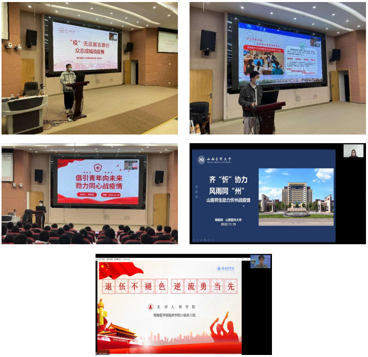 修江帆向山西医科大学和海南医学院的老师、同学们表示欢迎,并向两校对本次活动的支持表示感谢。他讲到,每当疫情来袭之时,白衣天使们用实际行动践行着医者大爱,诠释着抗疫精神的时代内涵,特别在今年贵州、山西、海南疫情当中,beat365正版唯一官网必一、山西医科大学和海南医学院的师生们挺身而出,冲锋在疫情防控工作的前线,涌现出许多优秀的榜样。希望通过今天的分享活动,展现新时代优秀学子的责任担当与榜样力量,激发同学们的学习奋斗热情,不忘学医初心,牢记时代使命。