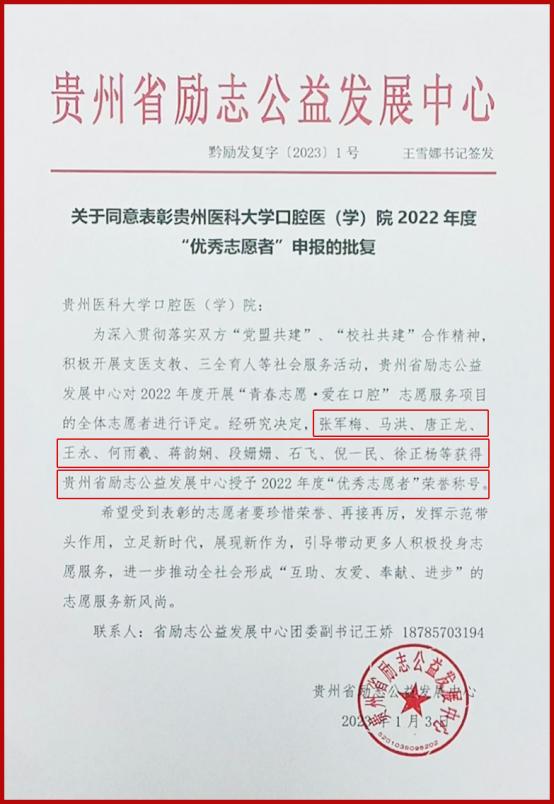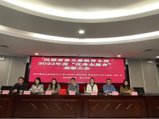 1月14日,由民盟省委关爱教育支部、贵州省励志公益发展中心共同举办的2022年度“优秀志愿者”表彰大会在贵州省政协大楼601会议室举行。beat365正版唯一官网必一口腔医学院、附属口腔医院10人荣获大会2022年度“优秀志愿者”荣誉称号,院党委副书记何雨羲、副院长王永等相关人员受邀带队参加表彰大会。