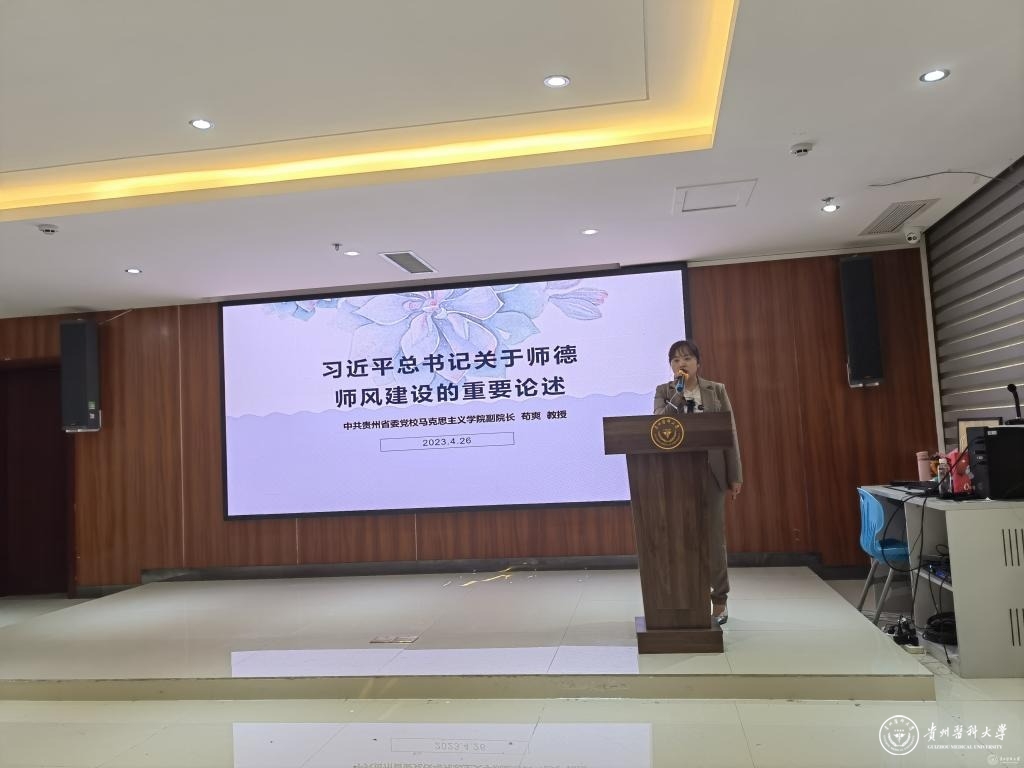 4月26日,党委教师工作部(教师工作处)在善思楼博安众创空间多功能厅举办“大医精诚”教师发展系列活动之师德师风专题教育讲座。中共贵州省委党校马克思主义学院副院长苟爽教授作题为“习近平总书记关于师德师风建设的重要论述”的专题讲座。全校两百多名教师代表参加。党委教师工作部(教师工作处)部长(处长)徐国强主持。