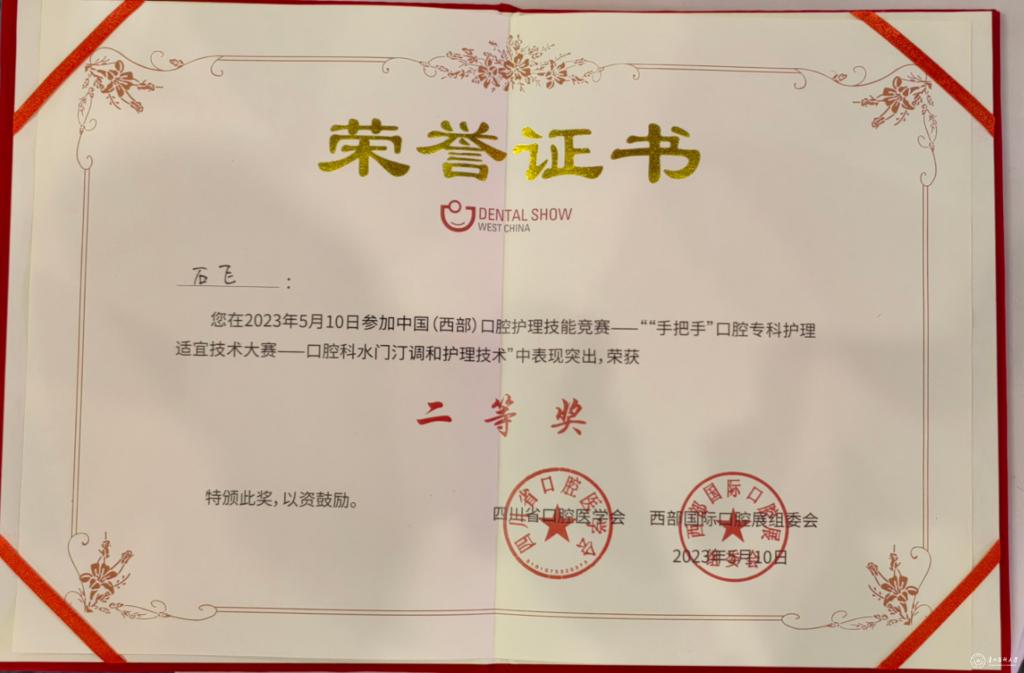 近日,中国(西部)口腔护理技能竞赛“‘手把手'口腔专科护理适宜技术大赛——口腔科水门汀调和护理技术”在成都举行,全国40多个医院代表队共75名选手参赛。附属口腔医院护理部董银银、修复种植科石飞、口腔正畸科李金芸、牙体牙髓科罗丹丹参赛。