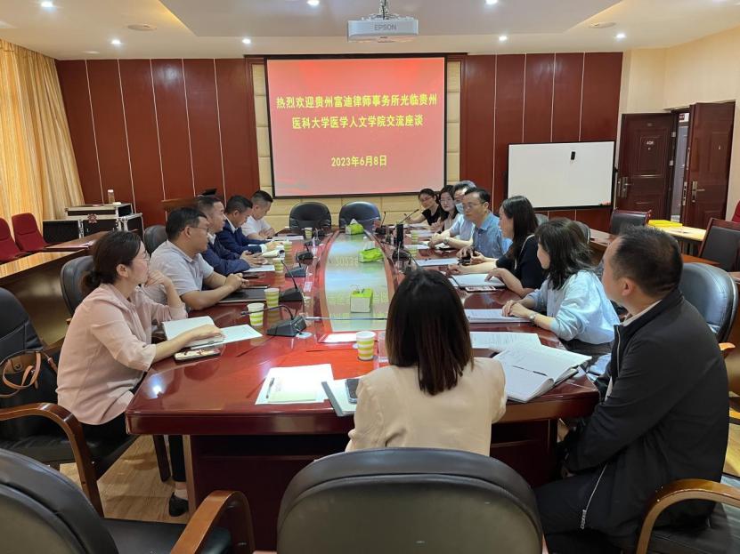 6月8日,贵州富迪律师事务所主任、省破产管理人协会会长归东,律所副主任、省律协行政执法专业委员会副主任张柱都,观山湖区第三届人大代表、执业律师颜仕武,律师郭天敏、付博雷一行到学院座谈交流。学院党委书记江宣成、正处级组织员韩贞习、副书记兼纪委书记张贤、心理健康教育与咨询中心副主任兼学院副院长彭丹及相关负责人参加。