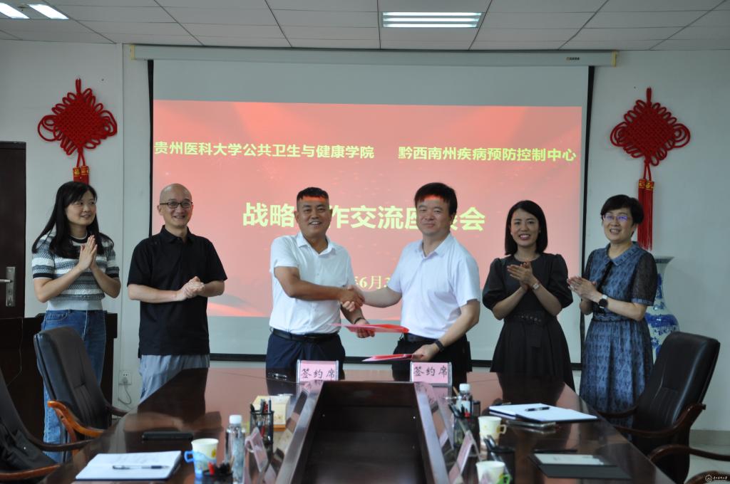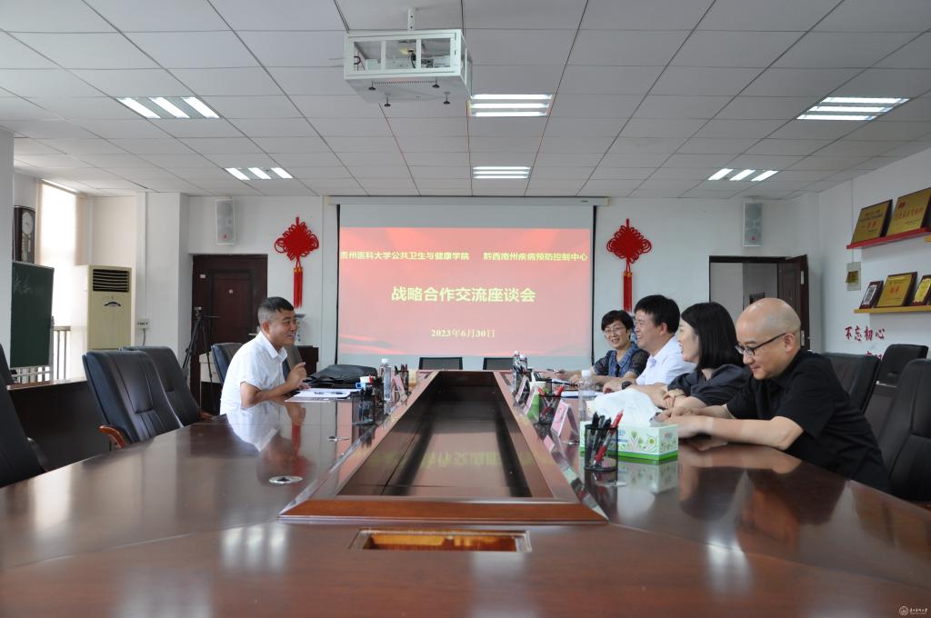 6月30日,beat365公共卫生与健康学院与黔西南州疾病预防控制中心开展合作交流座谈会暨战略合作协议签订仪式在beat365正版唯一官网必一南校区博雅楼二楼会议室举行。黔西南州疾病预防控制中心副主任吴营兴、学院党委书记郑维薇、院长洪峰、副书记何江、副院长李军、正科级组织员王胜利参加座谈会。