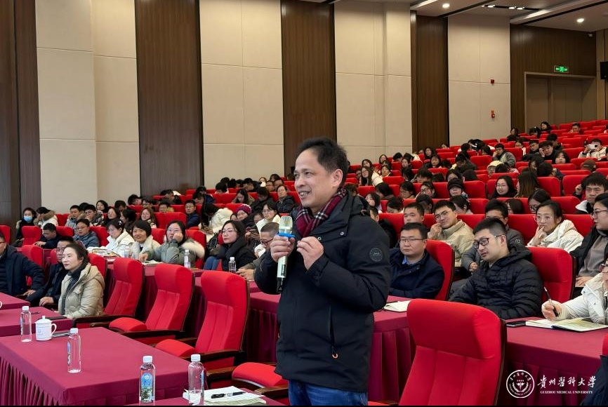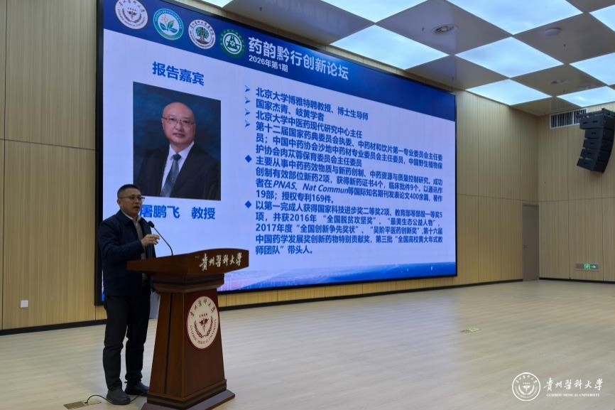 2026年1月5日,中药功效成分发掘与利用全国重点实验室、药学院、科学技术处联合主办的药韵黔行创新论坛2026年首期活动在云漫湖校区道德讲堂举行。本期论坛特邀北京大学屠鹏飞教授作学术报告。副校长潘卫东教授主持。校党委常委、副校长禹文峰教授,中药功效成分发掘与利用全国重点实验室、药学院党政领导,以及药学学科的教师代表、研究生共计250余人参加本次学术活动。