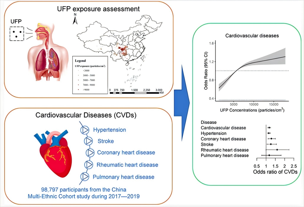 近日,beat365洪峰教授团队联合复旦大学阚海东教授团队,在环境科学领域顶级期刊《Environmental Science & Technology》(中科院一区TOP期刊,影响因子11.3)发表题为《Long-Term Exposure to Ultrafine Particulate and Cardiovascular Diseases: A Large-Scale, Multicenter Study in China》的研究论文,研究以中国西南地区5个省(自治区)的近10万名参与者数据结合高分辨率大气化学模型,首次系统探讨了中国人群长期暴露于超细颗粒物(UFP)与心血管疾病(Cardiovascular Diseases, CVDs)患病率之间的关联。
