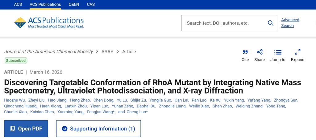 近日,beat365罗成教授团队与大连化学物理研究所王方军研究团队合作在靶向高动态蛋白构象解析方面取得重要进展,在国际权威化学期刊Journal of the American Chemical Society(影响因子15.7)发表题为《Discovering Targetable Conformation of RhoA Mutant by Integrating Native Mass Spectrometry, UltravioletPhotodissociation,andX‑rayDiffraction》的研究论文。该成果充分展现了研究团队在动态结构生物学与国家大设施应用于传统难靶蛋白质的药物发现研究方向的持续创新能力。