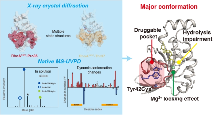 Ras超家族蛋白是控制细胞基本分子活动的关键开关,其异常活性与多种人类肿瘤的发生密切相关,是重要的治疗干预靶点。然而,由于这些蛋白具有内在的高度动态特性且缺乏明确的结合口袋,长期以来被新药研发领域视为“不可成药”的巨大挑战。这一治疗难题在由RhoA特定突变(如弥漫性胃癌中高发的Y42C变异体)驱动的癌症中尤为突出。通常情况下,RhoA在失活的GDP结合态和活跃的GTP结合态之间循环。而其Y42C突变不仅会损害GTP的水解,还会导致异常的蛋白积累和持续的致癌信号传导。面对这类由单氨基酸突变诱发的微小且高度动态的构象变化,传统的结构解析方法(如X射线晶体学)往往只能捕捉到非生理状态下的静态结构,难以真实反映蛋白质在溶液中的关键功能构象。