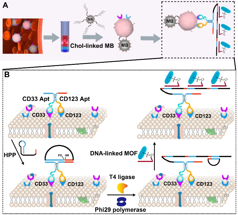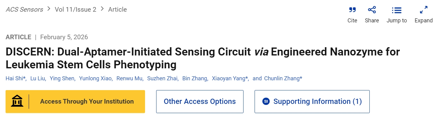 beat365基础医学院张春林教授团队的石海副教授主导完成的研究论文“DISCERN: Dual-Aptamer-Initiated Sensing Circuit via Engineered Nanozyme for Leukemia Stem Cells Phenotyping”,于2026年2月发表于国际期刊《ACS Sensors》(中科院一区TOP期刊,实时IF:10.4)。该研究开发了名为DISCERN的新型检测平台,通过双适配体启动的传感电路与工程化纳米酶组装,实现对白血病干细胞(LSCs)的高特异性、超灵敏表型分析,检测限低至8 cells/mL,为急性髓系白血病(AML)的复发预测和精准治疗提供了全新工具。